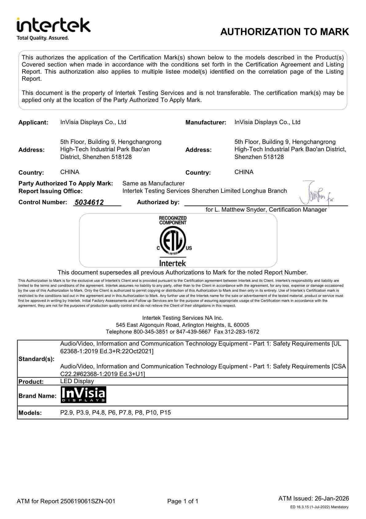 To achieve and maintain ETL compliance, InVisia undergoes regular factory inspections, during which Intertek auditors comprehensively review: